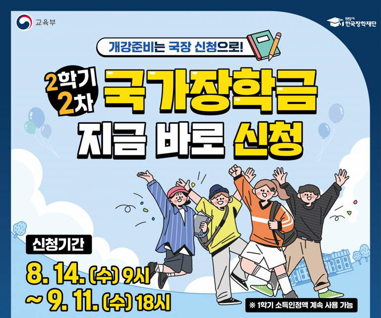 ▶ 한국장학재단(이사장 배병일)과 교육부(부총리 겸 교육부장관 이주호)는 8월 14일(수) 9시부터 9월 11일(수) 18시까지 2024학년도 2학기 2차 국가장학금 신청을 받는다.