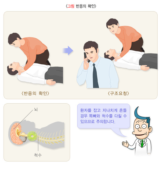 환자에게 접근하기 전에 구조자는 현장상황이 안전한지를 우선 확인하여, 안전하다고 판단되면 환자에게 다가가 어깨를 가볍게 두드리며 “괜찮으세요?”라고 물어봅니다. 이때 환자의 반응은 있으나 진료가 필요한 상태이면 119에 연락을 한 다음 환자의 상태를 자주 확인하면서 응급의료상담원의 지시를 따릅니다. 이 때 환자를 옆으로 눕히고, 환자의 한쪽 팔을 머리 밑으로 받쳐주는 자세를 취하게 함으로써, 숨쉬는 길로 이물질이 들어가는 것을 방지해 줄 수 있으며, 이 자세를 회복자세라고 부릅니다.