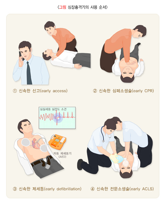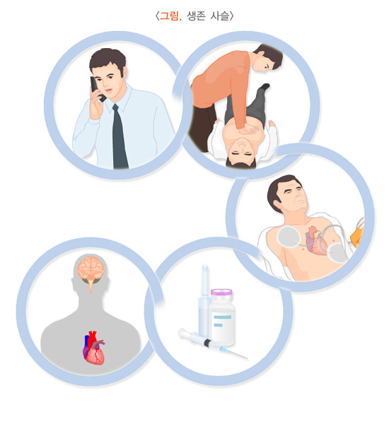 심정지 환자를 소생시키기 위한 이러한 일련의 과정은 사슬과 같이 서로 연결되어 있으므로, 이러한 요소들 중 어느 하나라도 적절히 시행되지 않으면 심정지 환자의 소생을 기대하기 어렵습니다. 이와 같이 병원 밖에서 심정지가 발생한 환자의 생존을 위하여 필수적인 과정이 서로 연결되어 있어야 한다는 개념을 “생존사슬(chain of survival)”이라고 합니다.