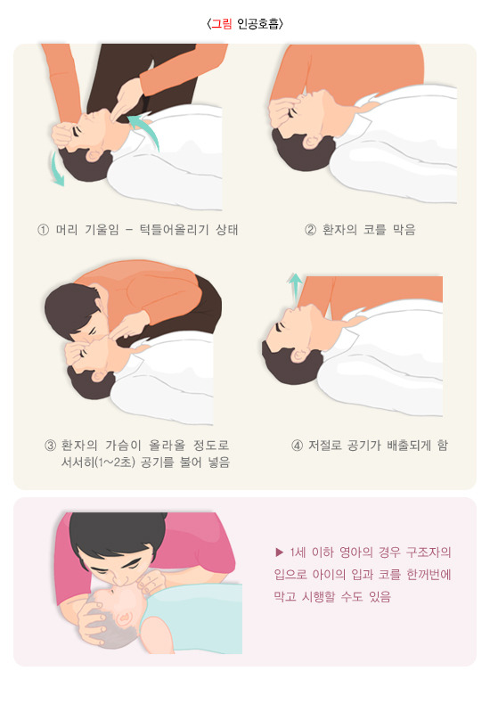 ‘머리기울임-턱들어올리기’ 방법으로 기도를 열어준 상태에서 환자의 입을 벌려줍니다. 머리를 젖힌 손의 엄지와 검지를 이용하여 환자의 코를 막고, 자신의 입을 환자의 입에 밀착 시킵니다. 이 때, 영아의 경우는 구조자의 입으로 아이의 입과 코를 한꺼번에 막고 시행할 수도 있습니다. 한쪽 눈으로 환자의 가슴을 주시하면서, 환자의 가슴이 팽창해 올라올 정도로 공기를 서서히(1~2초) 불어 넣습니다. 입을 떼고 환자의 입에서 불어 넣었던 공기가 다시 배출될 수 있도록 합니다. 같은 방법으로 1회 더 인공호흡을 시행합니다.
