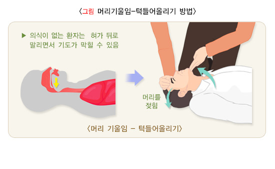 의식이 없는 환자의 경우 혀가 뒤로 말리면서 기도가 막힐 수 있으므로, 환자의 머리를 뒤로 기울이고 턱을 들어 올려주어서 기도를 열어주어야 합니다. 이 방법은 한 손을 심정지 환자의 이마에 대고 손바닥으로 압력을 가하여 환자의 머리가 뒤로 기울어지게 하면서, 다른 손의 손가락으로 아래턱의 뼈 부분을 머리 쪽으로 당겨 턱을 받쳐주어 머리를 뒤로 기울이는 것입니다. 이때 턱 아래 부위의 연부조직을 깊게 누르면 오히려 기도를 막을 수 있기 때문에 주의해야 합니다.